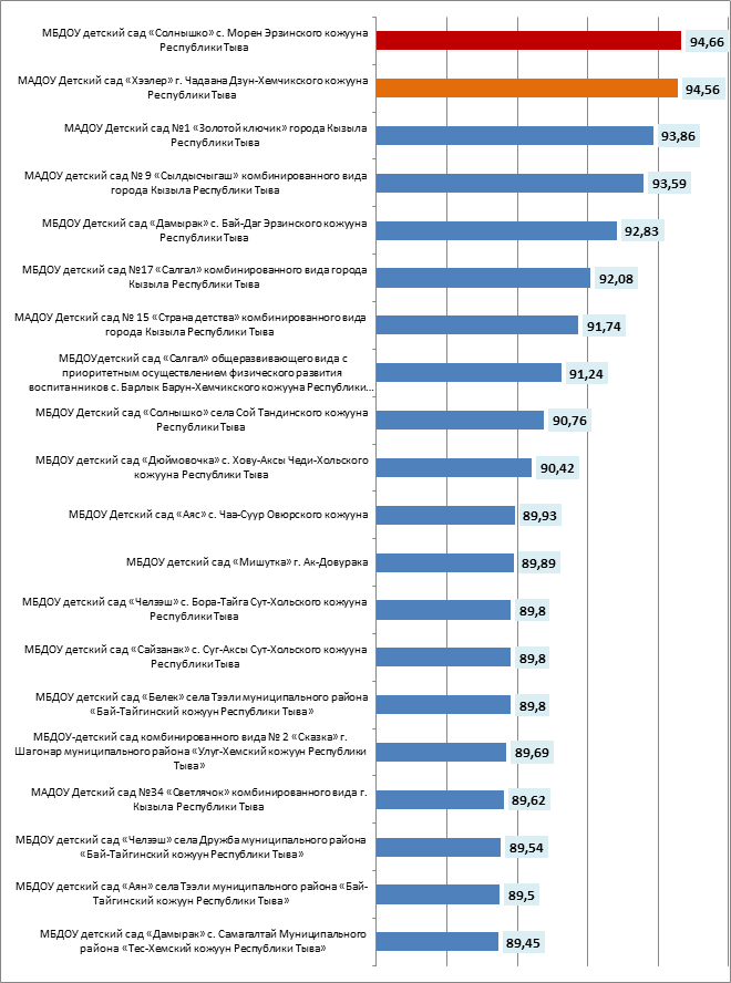 Второе место заняло МБДОУ детский сад «Солнышко» с. Морен Эрзинского кожууна Республики Тыва (94,66 баллов). На третьем месте — МАДОУ Детский сад «Хээлер» г. Чадаана Дзун-Хемчикского кожууна Республики Тыва (94,56 баллов), на четвертом – МАДОУ Детский сад №1 «Золотой ключик» города Кызыла Республики Тыва (93,86 балл), на пятом – МБОУ «Средняя общеобразовательная школа № 1 с. Кызыл-Мажалык Барун-Хемчикского кожууна Республики Тыва» (93,83 баллов).